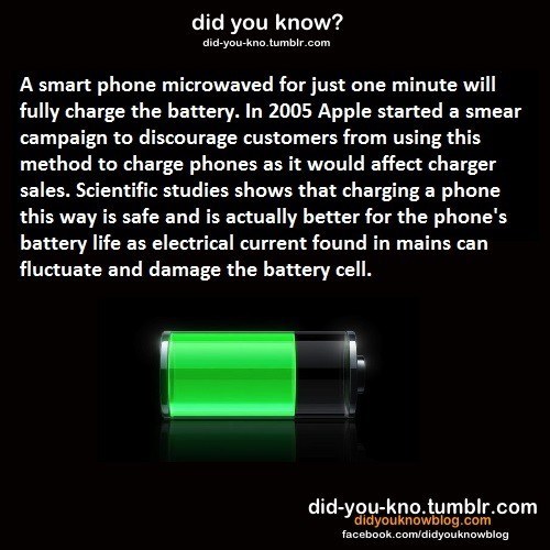 Glaubt man der Quelle http://didyouknowblog.com/, dann reicht es ein Smartphone für eine Minute in eine Mikrowelle zu legen, um den Akku wieder auf 100% zu bringen [via].
